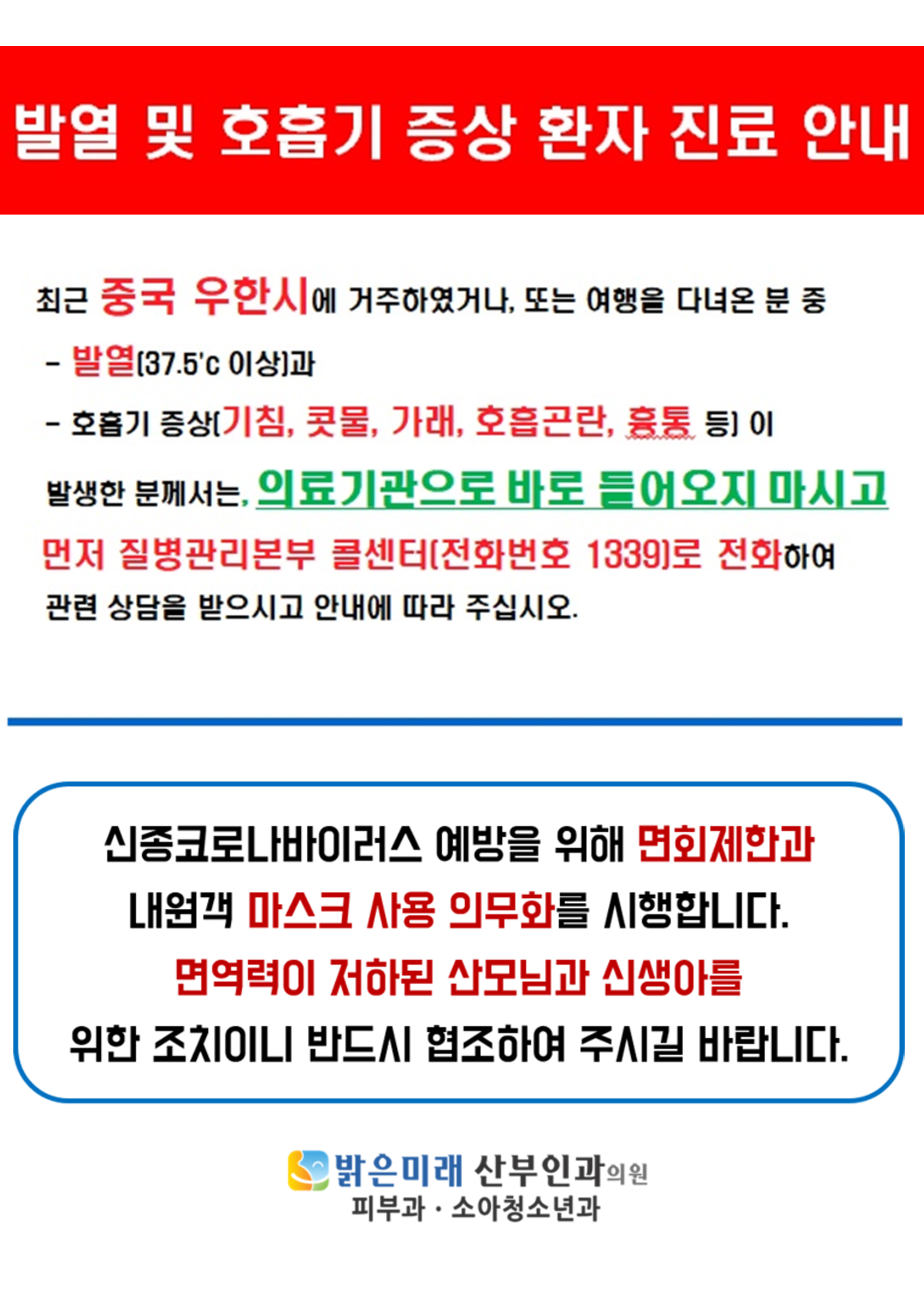 밝은미래 산부인과는 면역력이 약해진 산모님과 신생아의 안전을 위해 면회제한과 마스크 사용 의무화를 시행합니다. 불편하시더라고 반드시 협조 바랍니다. 감사합니다.